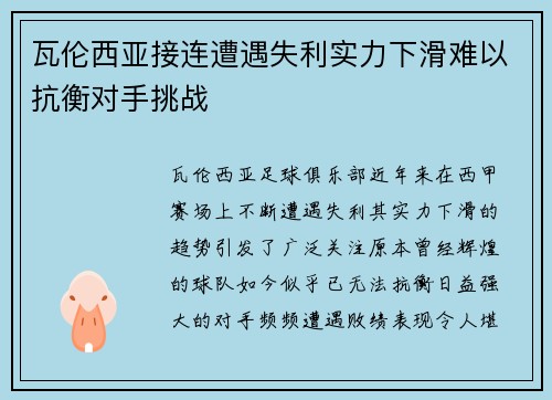 • 瓦伦西亚接连遭遇失利实力下滑难以抗衡对手挑战