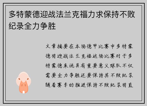 文章摘要:在本场德甲比赛中,多特蒙德将迎战法兰克福,这场比赛对于多特蒙德来说具有重要意义。球队不仅需要全力争胜,还要保持其不败纪录。随着赛季的推进,保持不败纪录将直接影响到球队的士气和争冠希望。因此,...
