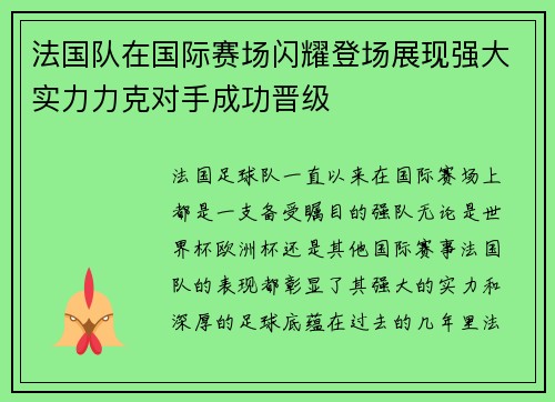• 法国队在国际赛场闪耀登场展现强大实力力克对手成功晋级