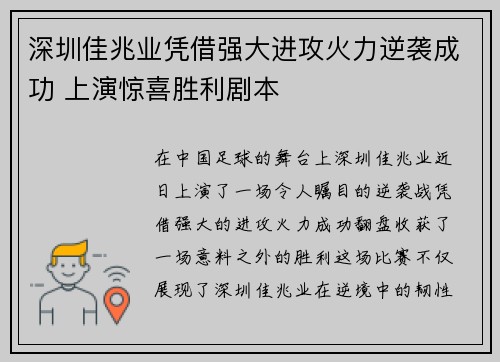 在中国足球的舞台上,深圳佳兆业近日上演了一场令人瞩目的逆袭战,凭借强大的进攻火力,成功翻盘,收获了一场意料之外的胜利。这场比赛不仅展现了深圳佳兆业在逆境中的韧性,也彰显了他们在进攻端的强大实力。球队的...