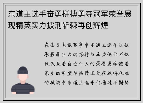 • 东道主选手奋勇拼搏勇夺冠军荣誉展现精英实力披荆斩棘再创辉煌