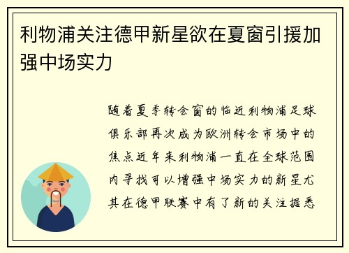 随着夏季转会窗的临近,利物浦足球俱乐部再次成为欧洲转会市场中的焦点。近年来,利物浦一直在全球范围内寻找可以增强中场实力的新星,尤其在德甲联赛中有了新的关注。据悉,利物浦对一位德甲新星表现出浓厚兴趣,这...