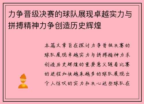 本篇文章旨在探讨力争晋级决赛的球队展现卓越实力与拼搏精神,力求创造历史辉煌的重要意义。随着比赛的进程加快,越来越多的球队展现出令人惊叹的实力和决心。这些球队在比赛中不仅要应对来自对手的强大挑战,还要面...