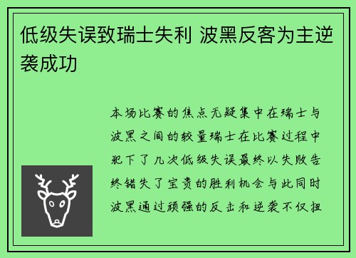 本场比赛的焦点无疑集中在瑞士与波黑之间的较量。瑞士在比赛过程中犯下了几次低级失误,最终以失败告终,错失了宝贵的胜利机会。与此同时,波黑通过顽强的反击和逆袭,不仅扭转了局势,还展现了强大的韧性和战术执行...
