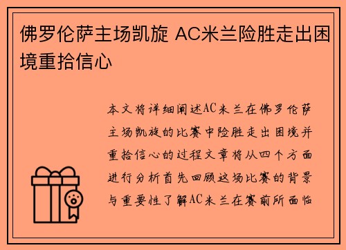 本文将详细阐述AC米兰在佛罗伦萨主场凯旋的比赛中险胜,走出困境并重拾信心的过程。文章将从四个方面进行分析:首先,回顾这场比赛的背景与重要性,了解AC米兰在赛前所面临的压力与挑战;其次,分析球队在比赛中...