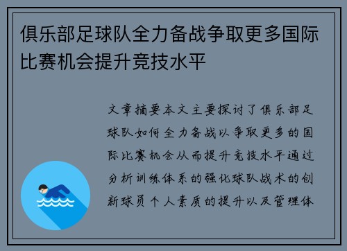 文章摘要:本文主要探讨了俱乐部足球队如何全力备战,以争取更多的国际比赛机会,从而提升竞技水平。通过分析训练体系的强化、球队战术的创新、球员个人素质的提升以及管理体系的完善四个方面,详细阐述了俱乐部足球...