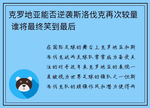 在国际足球的舞台上,克罗地亚和斯洛伐克这两支球队常常成为备受关注的对手。近年来,克罗地亚的表现一度被视为世界足球的强队之一,但斯洛伐克队的顽强作风和潜力使得两队的较量格外引人注目。本文将围绕“克罗地亚...