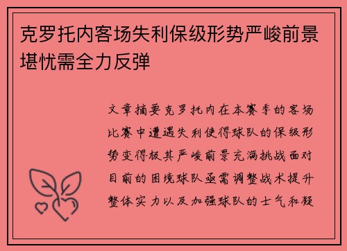 文章摘要:克罗托内在本赛季的客场比赛中遭遇失利,使得球队的保级形势变得极其严峻,前景充满挑战。面对目前的困境,球队亟需调整战术、提升整体实力以及加强球队的士气和凝聚力,以全力迎接接下来的比赛。这篇文章...