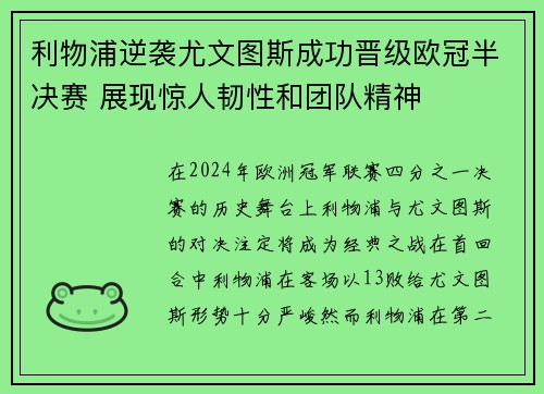 在2024年欧洲冠军联赛四分之一决赛的历史舞台上,利物浦与尤文图斯的对决注定将成为经典之战。在首回合中,利物浦在客场以1-3败给尤文图斯,形势十分严峻。然而,利物浦在第二回合的逆袭不仅让人惊讶,更让全...