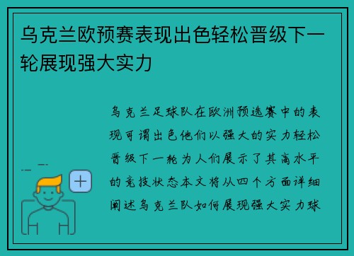 乌克兰足球队在欧洲预选赛中的表现可谓出色,他们以强大的实力轻松晋级下一轮,为人们展示了其高水平的竞技状态。本文将从四个方面详细阐述乌克兰队如何展现强大实力:球队的战术执行力、关键球员的表现、主教练的战...