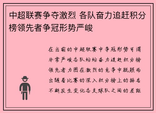 在当前的中超联赛中,争冠形势可谓非常严峻,各队纷纷奋力追赶积分榜领先者,力图在激烈的竞争中脱颖而出。随着比赛的深入,积分榜上的排名不断发生变化,各支球队之间的差距逐渐缩小,争夺冠军的悬念也愈加扑朔迷离...