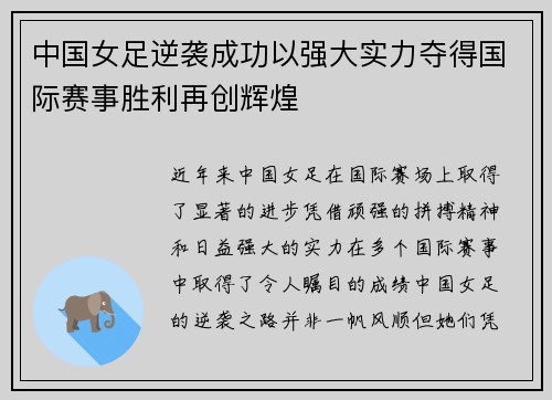 近年来,中国女足在国际赛场上取得了显著的进步,凭借顽强的拼搏精神和日益强大的实力,在多个国际赛事中取得了令人瞩目的成绩。中国女足的逆袭之路并非一帆风顺,但她们凭借着坚定的信念和持续的努力,不断突破自我...