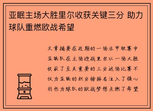 文章摘要:ng体育在近期的一场法甲联赛中,亚眠队在主场迎战里尔,以一场大胜收获了至关重要的三分。这场比赛不仅为亚眠的积分榜排名注入了强心剂,也为球队的欧...