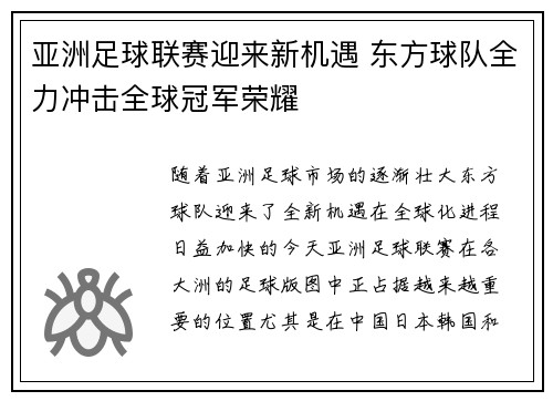 随着亚洲足球市场的逐渐壮大,东方球队迎来了全新机遇。在全球化进程日益加快的今天,亚洲足球联赛在各大洲的足球版图中正占据越来越重要的位置,尤其是在中国、日本、韩国和西亚国家等地区,足球的基础设施、球员水...