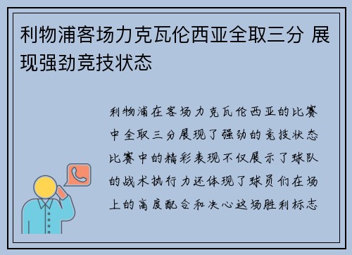 利物浦在客场力克瓦伦西亚的比赛中全取三分,展现了强劲的竞技状态。比赛中的精彩表现不仅展示了球队的战术执行力,还体现了球员们在场上的高度配合和决心。这场胜利标志着利物浦本赛季的良好开局,同时也证明了他们...
