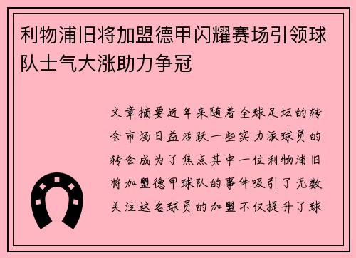 文章摘要:近年来,随着全球足坛的转会市场日益活跃,一些实力派球员的转会成为了焦点。其中,一位利物浦旧将加盟德甲球队的事件吸引了无数关注。这名球员的加盟不仅提升了球队的实力,更极大地激励了队友,推动了整...