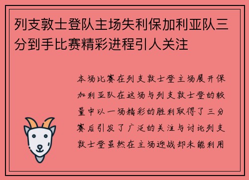 本场比赛在列支敦士登主场展开,保加利亚队在这场与列支敦士登的较量中以一场精彩的胜利取得了三分,赛后引发了广泛的关注与讨论。列支敦士登虽然在主场迎战,却未能利用主场优势最终取得胜利,反而在比赛过程中展现...