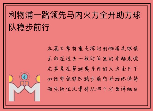 本篇文章将重点探讨利物浦足球俱乐部在过去一段时间里的卓越表现,尤其是在萨迪奥·马内的火力全开下,如何带领球队稳步前行并始终保持领先地位。文章将从四个方面详细分析利物浦的表现,包括:一、球队整体实力的提...