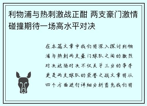 在本篇文章中,我们将深入探讨利物浦与热刺两支豪门球队之间的激烈对决。这场对决不仅关乎三分的争夺,更是两支球队的荣誉之战。文章将从四个方面进行详细分析:首先,我们将分析两支球队的历史背景与相互对抗的传统...