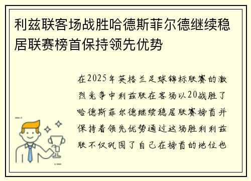 在2025年英格兰足球锦标联赛的激烈竞争中,利兹联在客场以2-0战胜了哈德斯菲尔德,继续稳居联赛榜首,并保持着领先优势。通过这场胜利,利兹联不仅巩固了自己在榜首的地位,也展示了球队的强大实力和优良状态...