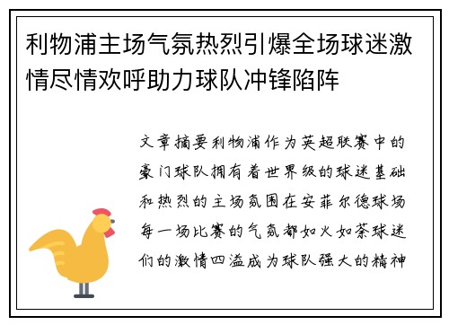 文章摘要:利物浦作为英超联赛中的豪门球队,拥有着世界级的球迷基础和热烈的主场氛围。在安菲尔德球场,每一场比赛的气氛都如火如荼,球迷们的激情四溢成为球队强大的精神动力。这篇文章将从四个方面详细探讨利物浦...