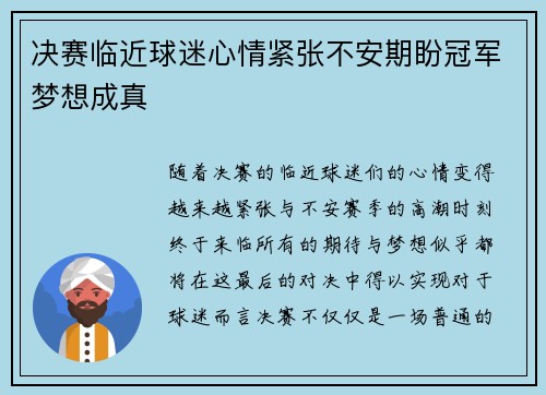 随着决赛的临近,球迷们的心情变得越来越紧张与不安。赛季的高潮时刻终于来临,所有的期待与梦想似乎都将在这最后的对决中得以实现。对于球迷而言,决赛不仅仅是一场普通的比赛,而是对球队辛勤付出的检验,是一场关...