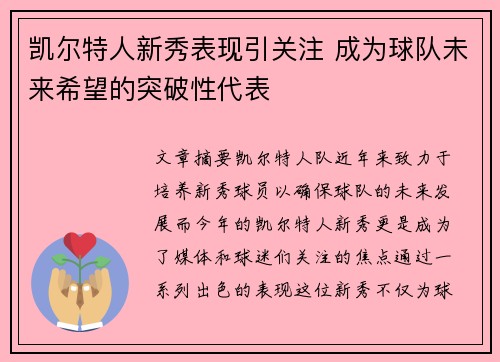 文章摘要:凯尔特人队近年来致力于培养新秀球员,以确保球队的未来发展,而今年的凯尔特人新秀更是成为了媒体和球迷们关注的焦点。通过一系列出色的表现,这位新秀不仅为球队带来了新的活力,也展现了成为球队未来核...