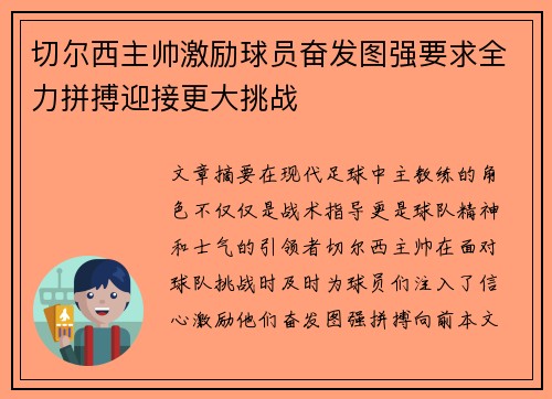 文章摘要:在现代足球中,主教练的角色不仅仅是战术指导,更是球队精神和士气的引领者。切尔西主帅在面对球队挑战时,及时为球员们注入了信心,激励他们奋发图强,拼搏向前。本文将详细探讨切尔西主帅如何通过言传身...