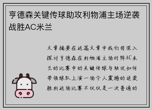 文章摘要:在这篇文章中,我们将深入探讨亨德森在利物浦主场对阵AC米兰的比赛中的关键传球与助攻,如何带领球队上演一场令人震撼的逆袭胜利。这场比赛不仅仅是一次普通的欧洲战场对决,它象征着利物浦在亨德森的带...