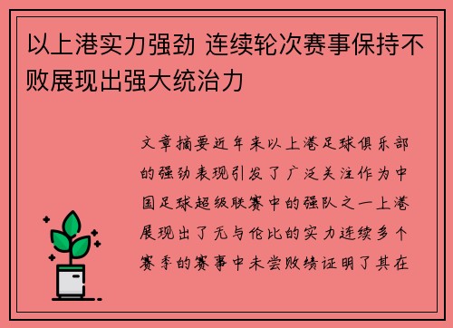 文章摘要:近年来,以上港足球俱乐部的强劲表现引发了广泛关注。作为中国足球超级联赛中的强队之一,上港展现出了无与伦比的实力,连续多个赛季的赛事中未尝败绩,证明了其在国内外赛场上的统治力。本篇文章将从四个...