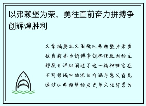 文章摘要:本文围绕“以弗赖堡为荣,勇往直前奋力拼搏争创辉煌胜利”的主题展开,详细阐述了这一精神理念在不同领域中的深刻内涵与意义。首先,通过以弗赖堡的历史与文化背景为切入点,展现了这座城市在多个方面的卓...