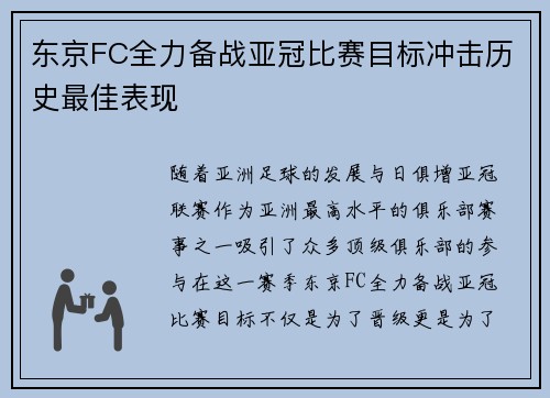 随着亚洲足球的发展与日俱增,亚冠联赛作为亚洲最高水平的俱乐部赛事之一,吸引了众多顶级俱乐部的参与。在这一赛季,东京FC全力备战亚冠比赛,目标不仅是为了晋级,更是为了冲击历史最佳表现。球队的整体实力、战...