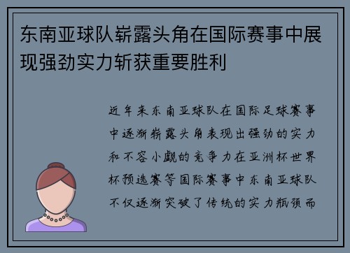 近年来,东南亚球队在国际足球赛事中逐渐崭露头角,表现出强劲的实力和不容小觑的竞争力。在亚洲杯、世界杯预选赛等国际赛事中,东南亚球队不仅逐渐突破了传统的实力瓶颈,而且也斩获了一些令人瞩目的胜利,这无疑为...