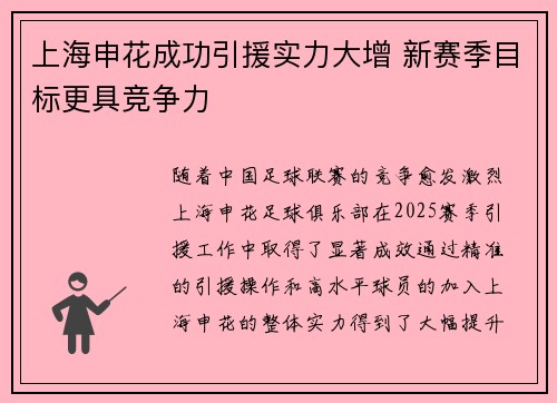 随着中国足球联赛的竞争愈发激烈,上海申花足球俱乐部在2025赛季引援工作中取得了显著成效。通过精准的引援操作和高水平球员的加入,上海申花的整体实力得到了大幅提升,为新赛季的竞争奠定了坚实的基础。在球迷...