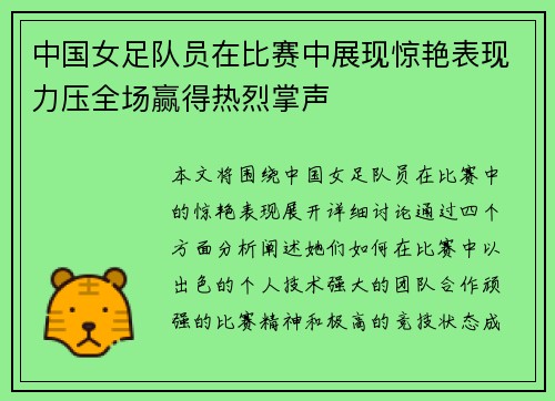 本文将围绕中国女足队员在比赛中的惊艳表现展开详细讨论。通过四个方面分析,阐述她们如何在比赛中以出色的个人技术、强大的团队合作、顽强的比赛精神和极高的竞技状态,成功压制对手,赢得全场热烈掌声。这些因素不...
