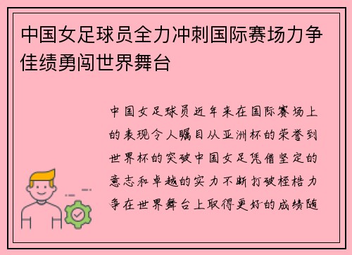 中国女足球员近年来在国际赛场上的表现令人瞩目。从亚洲杯的荣誉到世界杯的突破,中国女足凭借坚定的意志和卓越的实力不断打破桎梏,力争在世界舞台上取得更好的成绩。随着比赛压力的增大和国际竞争的加剧,中国女足...
