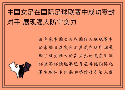 近年来,中国女足在国际足球联赛中的表现日益突出,尤其是在防守端展现了极为强大的实力。无论是在亚洲杯、世界杯预选赛,还是在其他国际比赛中,球队多次成功零封对手,给人留下了深刻的印象。本文将从四个方面详细...