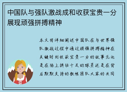 本文将详细阐述中国队在与世界强队激战过程中,通过顽强拼搏精神在关键时刻收获宝贵一分的故事。无论是在场上拼劲十足的球员,还是在背后默默支持的教练团队,大家的共同努力都促使中国队能够在与实力强大的对手交锋...