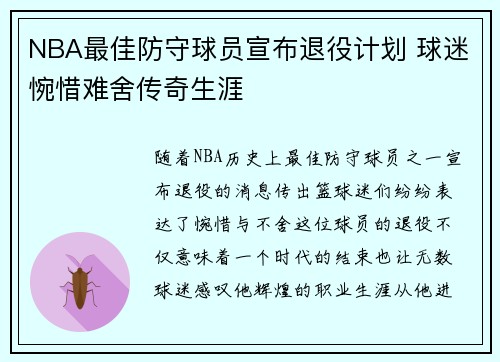 随着NBA历史上最佳防守球员之一宣布退役的消息传出,篮球迷们纷纷表达了惋惜与不舍。这位球员的退役,不仅意味着一个时代的结束,也让无数球迷感叹他辉煌的职业生涯。从他进入NBA开始,这位防守巨星就以其坚韧...