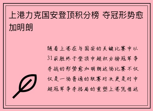 随着上港在与国安的关键比赛中以3-1获胜,终于登顶中超积分榜,冠军争夺战的形势愈加明朗。这场比赛不仅仅是一场普通的联赛对决,更是对中超冠军争夺格局的重塑。上港凭借这场胜利,不仅展示了强大的竞技实力,还...
