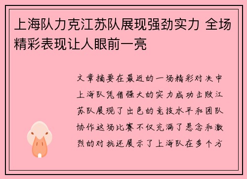 文章摘要:在最近的一场精彩对决中,上海队凭借强大的实力成功击败江苏队,展现了出色的竞技水平和团队协作。这场比赛不仅充满了悬念和激烈的对抗,还展示了上海队在多个方面的优势。无论是攻防转换的速度、球员个人...