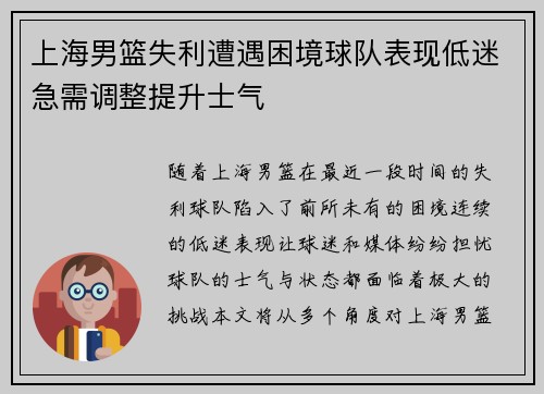 • 上海男篮失利遭遇困境球队表现低迷急需调整提升士气