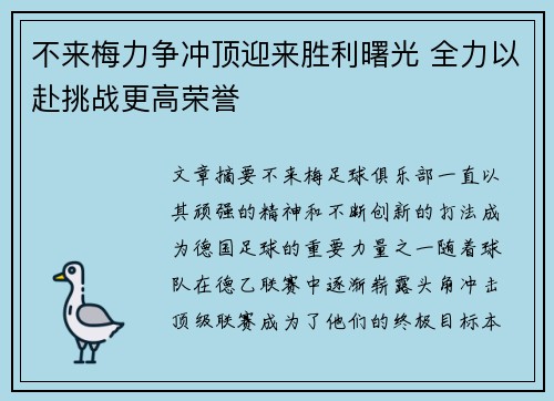 • 不来梅力争冲顶迎来胜利曙光 全力以赴挑战更高荣誉