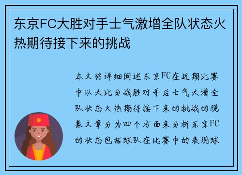 本文将详细阐述东京FC在近期比赛中以大比分战胜对手后,士气大增,全队状态火热,期待接下来的挑战的现象。文章分为四个方面来分析东京FC的状态,包括球队在比赛中的表现、球员状态的提升、教练团队的贡献以及球...