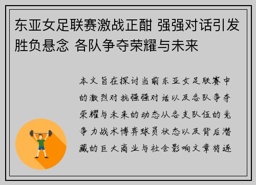 本文旨在探讨当前东亚女足联赛中的激烈对抗、强强对话以及各队争夺荣耀与未来的动态。从各支队伍的竞争力、战术博弈、球员状态、以及背后潜藏的巨大商业与社会影响,文章将逐步展开分析。首先,我们将简要回顾东亚女...