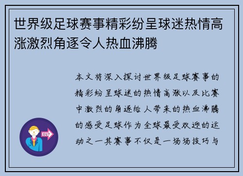 • 世界级足球赛事精彩纷呈球迷热情高涨激烈角逐令人热血沸腾