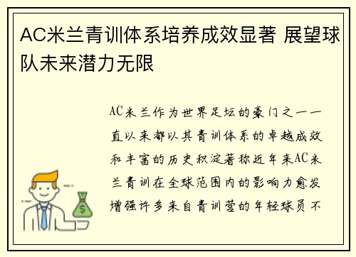AC米兰作为世界足坛的豪门之一,一直以来都以其青训体系的卓越成效和丰富的历史积淀著称。近年来,AC米兰青训在全球范围内的影响力愈发增强,许多来自青训营的年轻球员不断崭露头角,逐渐成为球队的重要力量。这...