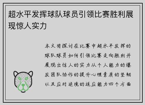 本文将探讨在比赛中,超水平发挥的球队球员如何引领比赛走向胜利,并展现出惊人的实力。从个人能力的爆发、团队协作的提升、心理素质的坚韧以及应对逆境的适应能力四个方面来进行详细分析。这些方面不仅是球员超水平...