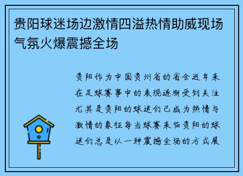 贵阳,作为中国贵州省的省会,近年来在足球赛事中的表现逐渐受到关注,尤其是贵阳的球迷们,已成为热情与激情的象征。每当球赛来临,贵阳的球迷们总是以一种震撼全场的方式,展现出他们对足球的热爱与支持。在球场的...