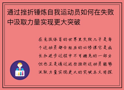 在竞技体育的世界里,失败几乎是每个运动员都会经历的必修课。它是成长和进步过程中不可避免的一部分,但也正是通过这些挫折,运动员能够汲取力量,实现更大的突破。本文将探讨运动员如何通过挫折锤炼自我,如何在失...